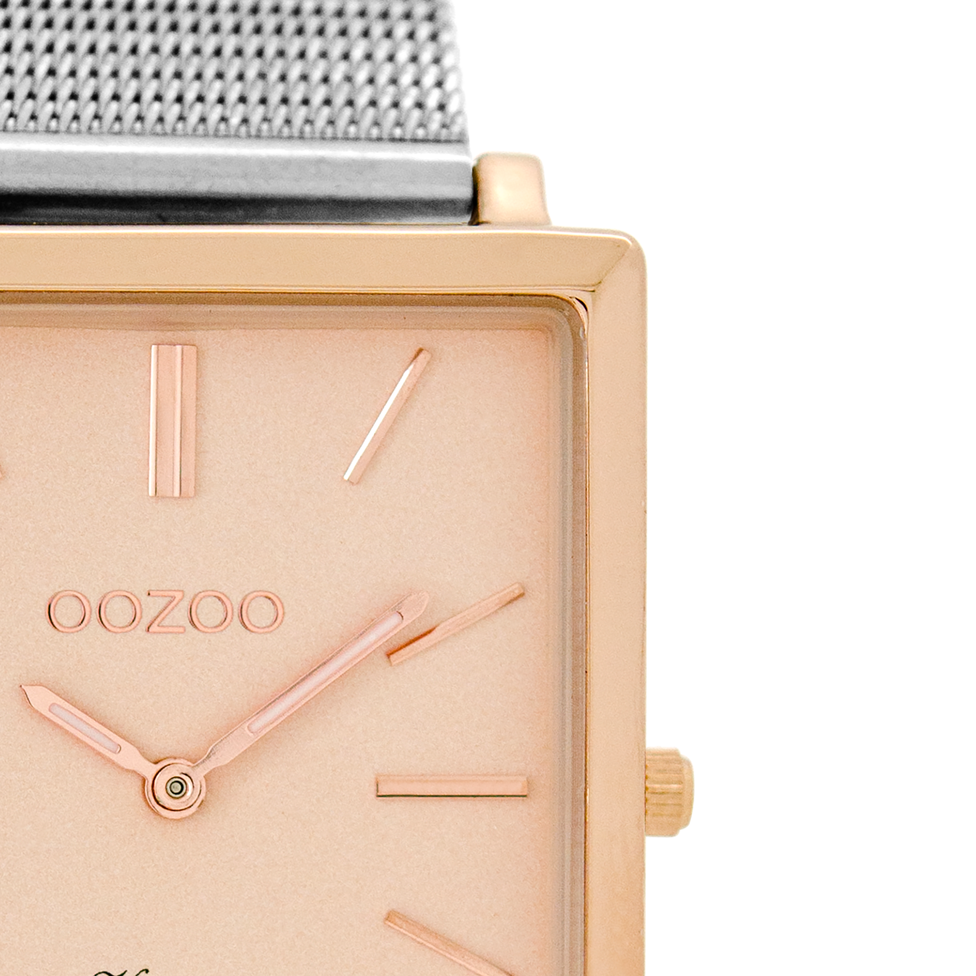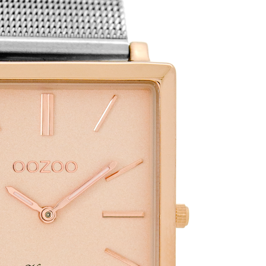The classic look stays key in this trendy series and therefore, this rectangle OOZOO vintage design with a playful wink is the season must-have! This unisex watch is the perfect combination of fashion and comfort with its 37x31 mm rose gold coloured metal watch case and rose gold coloured dial. The silver coloured metal mesh bracelet makes this watch a trendy accessory, which you can wear every day. The dial has rose gold coloured stripes digits and matching hands. The C8182 adds the sparkle to your outfit. The mineral glass lays in a 6,9 mm slim metal watch case with IP-plating. This design has a stainless steel backplate and is nickel safe. This watch has a 2 Japanese movement and is covered by a 2 year warranty (see section 3 of our Refund, shipping & warranty policy).