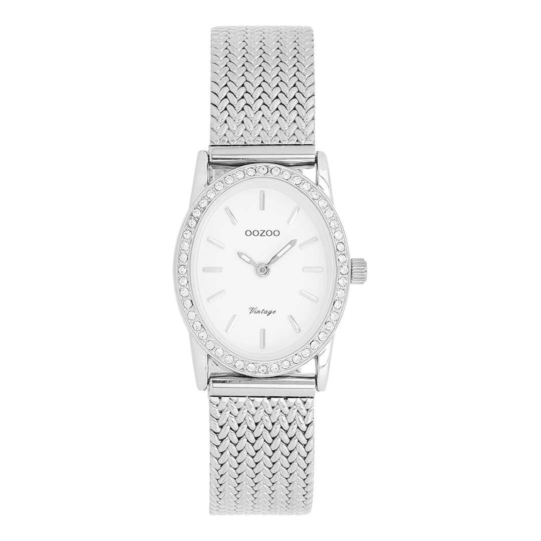 The classic look stays key in this trendy series and therefore, this oval OOZOO vintage design with a playful wink is the season must-have! This ladies watch is the perfect combination of fashion and comfort with its 28x23 mm silver coloured metal with crystals watch case and white dial. The silver coloured metal v-mesh bracelet makes this watch a trendy accessory, which you can wear every day. The dial has silver coloured stripes digits and matching hands. The C20430 adds the sparkle to your outfit. The mineral glass lays in a mm slim metal watch case with IP-plating. This design has a stainless steel backplate and is nickel safe. This watch has a 2ATM Japanese movement and is covered by a 2 year warranty (see section 3 of our Refund, shipping & warranty policy).